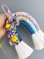 Embellished macrame rainbow wallhanging. Made from cotton rope, wrapped in cotton and braided cord, adorned with a large variety czech glass and gemstone beads, including my own hand made polymer clay flowers, each sewn on by hand.