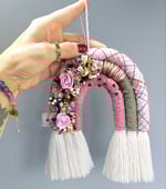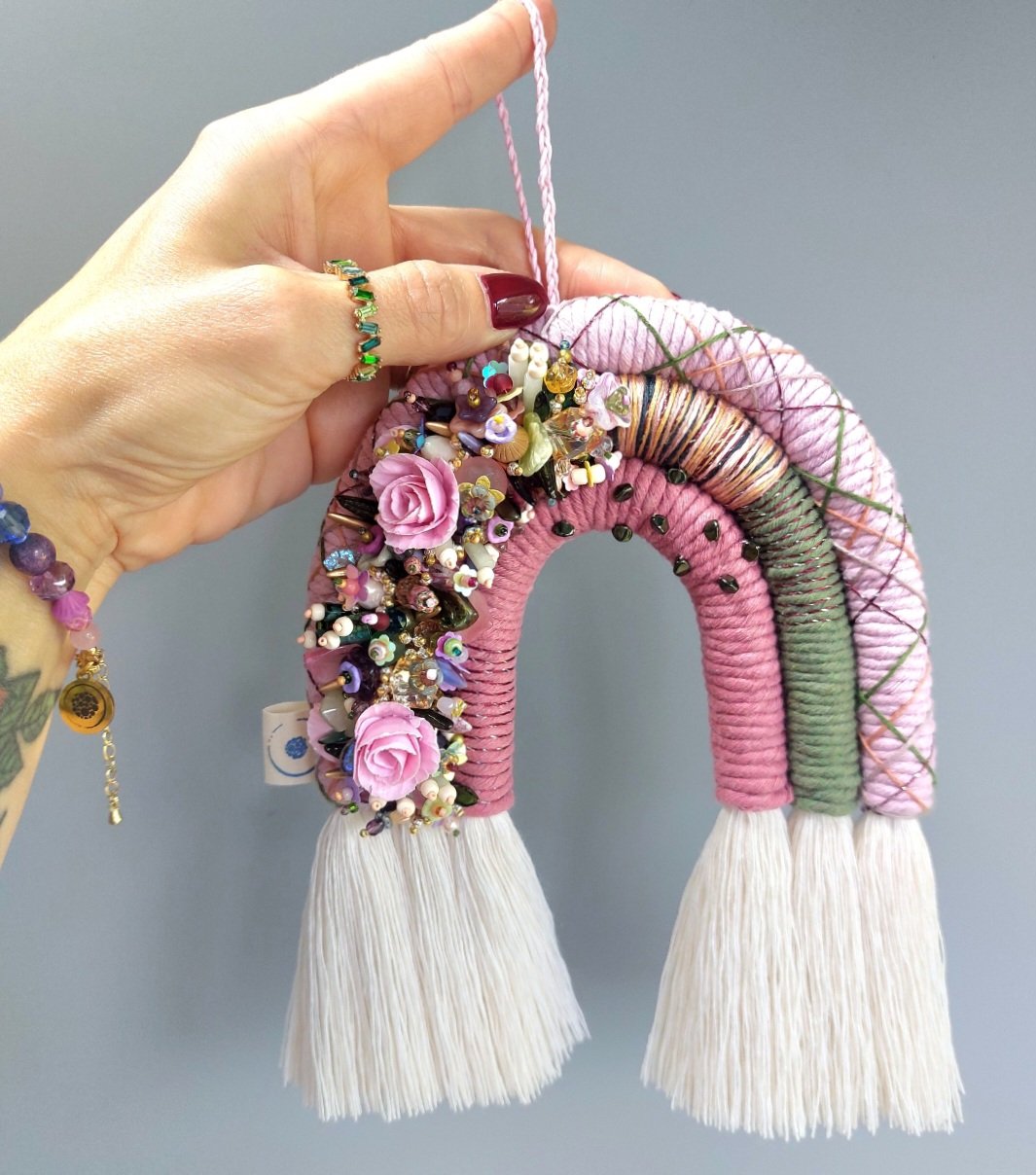 Embellished macrame rainbow wallhanging. Made from cotton rope, wrapped in cotton and braided cord, adorned with a large variety czech glass and gemstone beads, including my own hand made polymer clay flowers, each sewn on by hand.