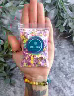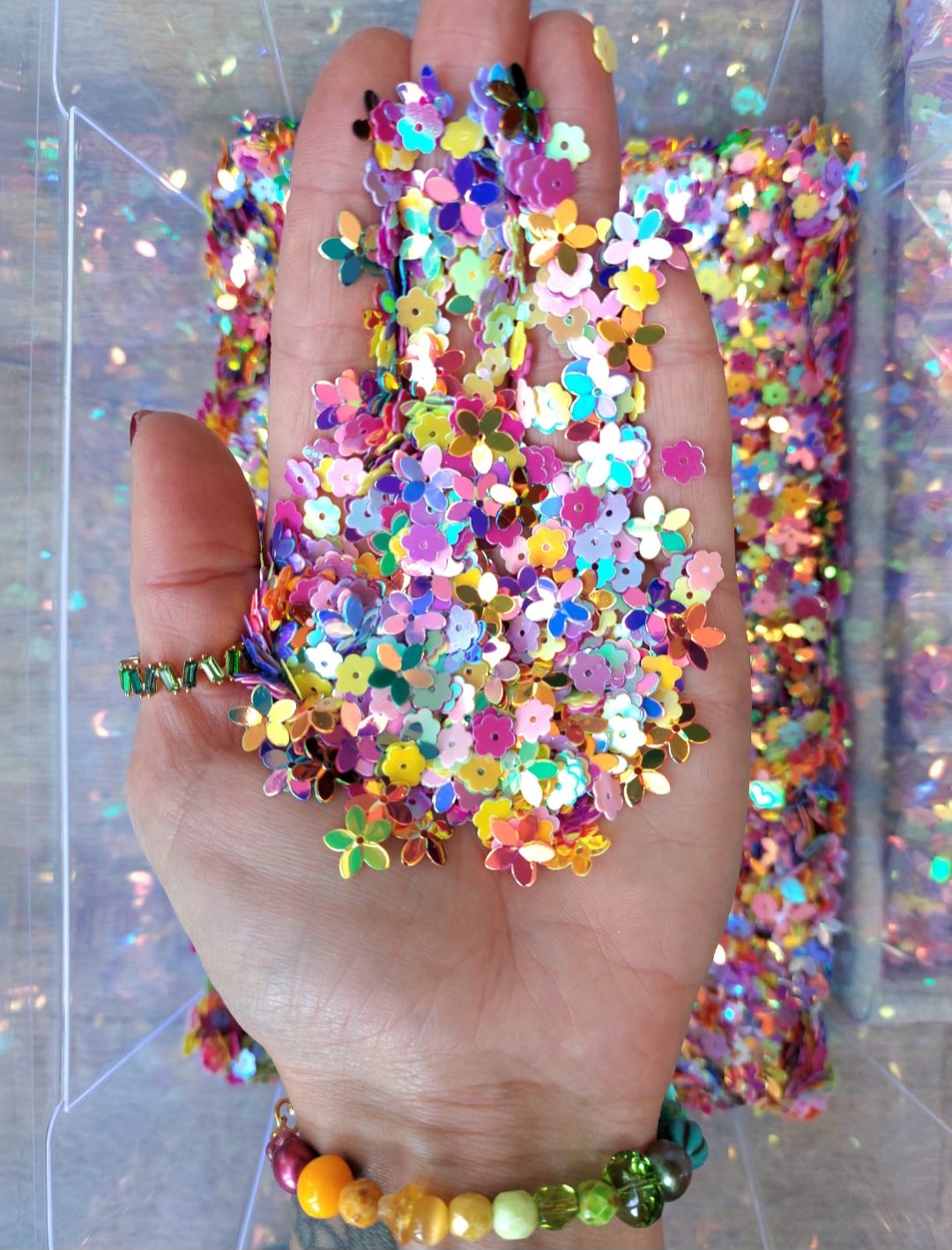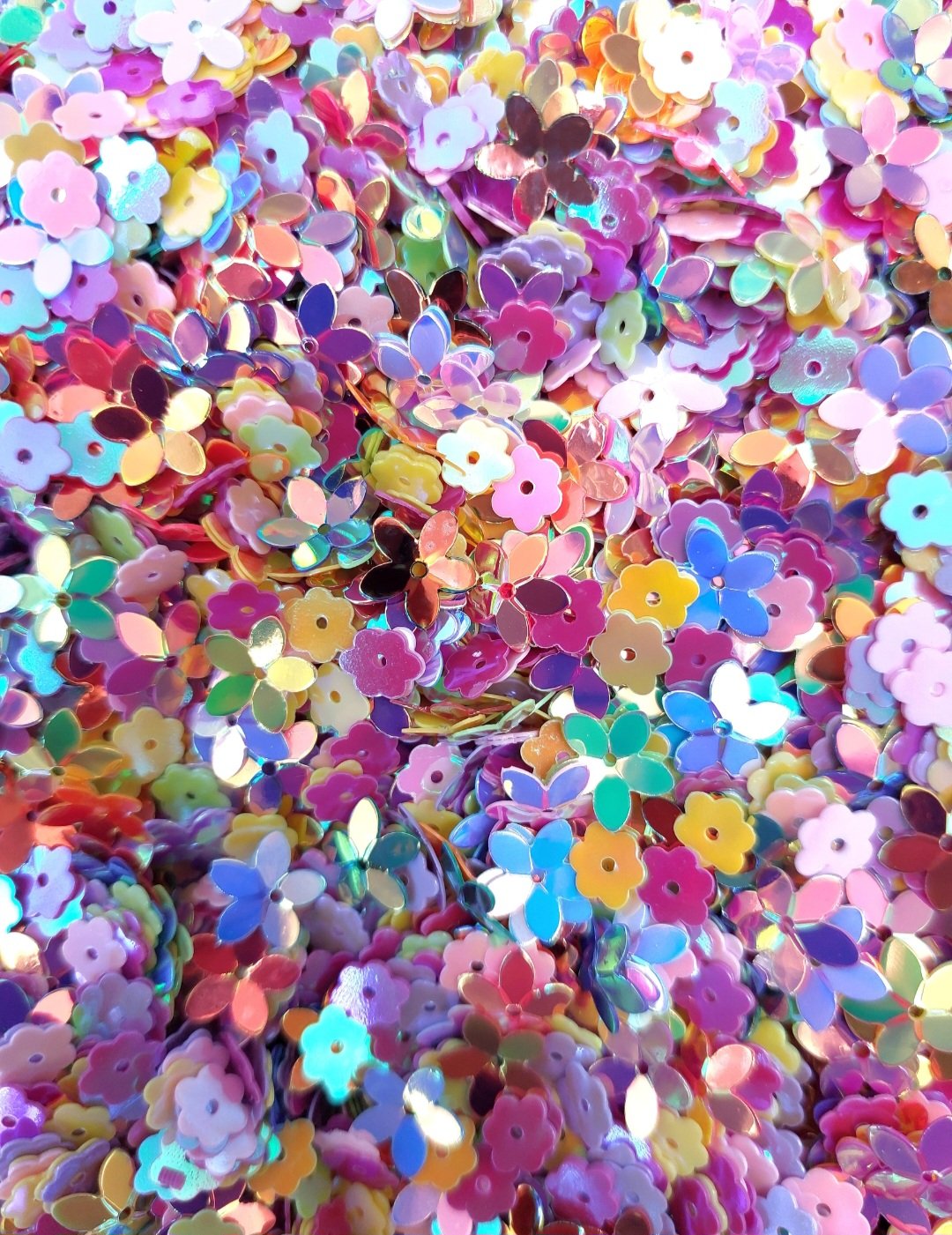 30gram bag of floral sequins in pinks, purples, yellows, greens and orange, with holes to sew for embellishments and embroidery.