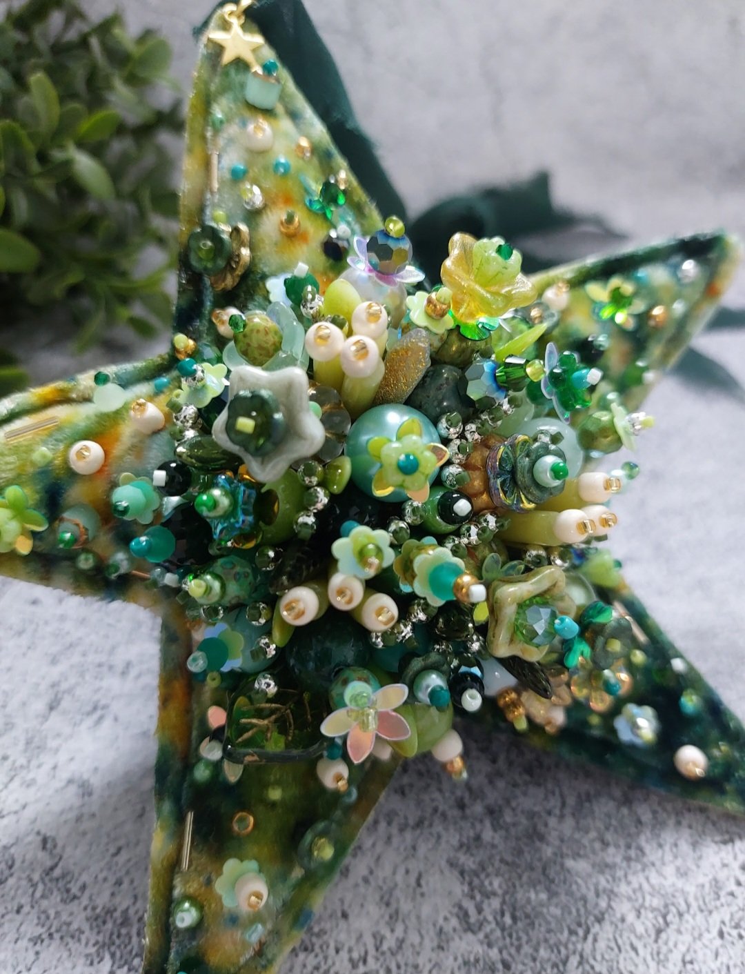 A ready made hand Embellished Star Ornament. Made from silk velvet that has been heavily hand embroidered with czeck glass beads, gemstones and sequins. A unique, heirloom worthy piece to add to your decorative collection.